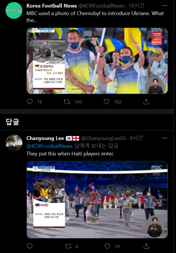 Mbc 올림픽 논란: (사진=mbc 올림픽 중계 화면)이데일리 스타in 김보영 기자 mbc가 2020 도쿄올림픽 개회식 생중계 중 각국 선수단 소개에 부적절한 자막 및 사진들을 사용하는 방송사고로 누리꾼들의 여론 뭇매를 맞고 있다.